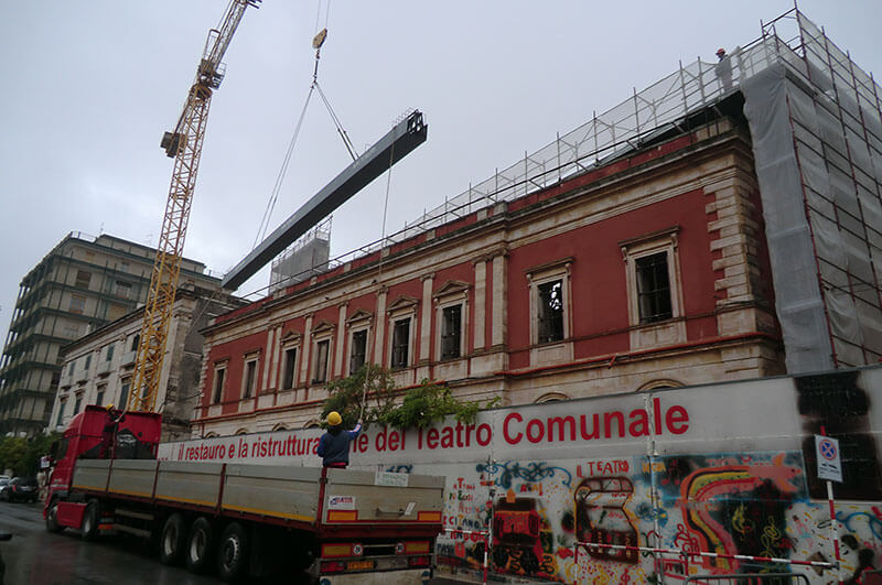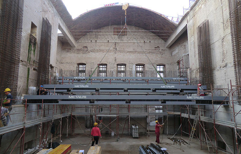 Sul palcoscenico, a quota + 15,85 m, è stato realizzato un impalcato con Travi MTR® A principali e profili d’acciaio in HE a realizzare un graticcio. Il tutto per la sistemazione dei tiri elettromeccanici delle scene, con un sovraccarico accidentale pari a 1000 kg/m2.