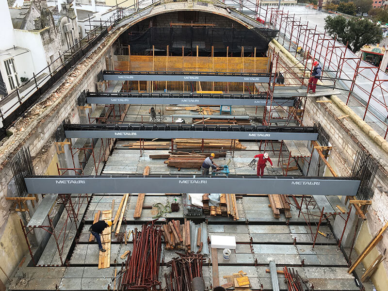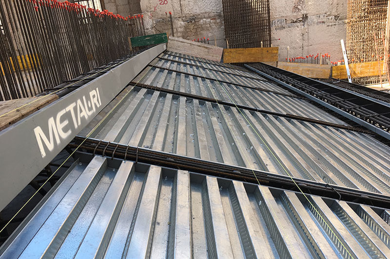 Il solaio della Zona Galleria è stato realizzato con un graticcio di Travi MTR® A, principali e secondarie in abbinamento ad un solaio in lamiera grecata collaborante. Una soluzione “super leggera”, totalmente autoportante, senza puntelli e casseri, con la particolarità e complessità di generare un solaio inclinato (da 3,17 a 5,45 m)